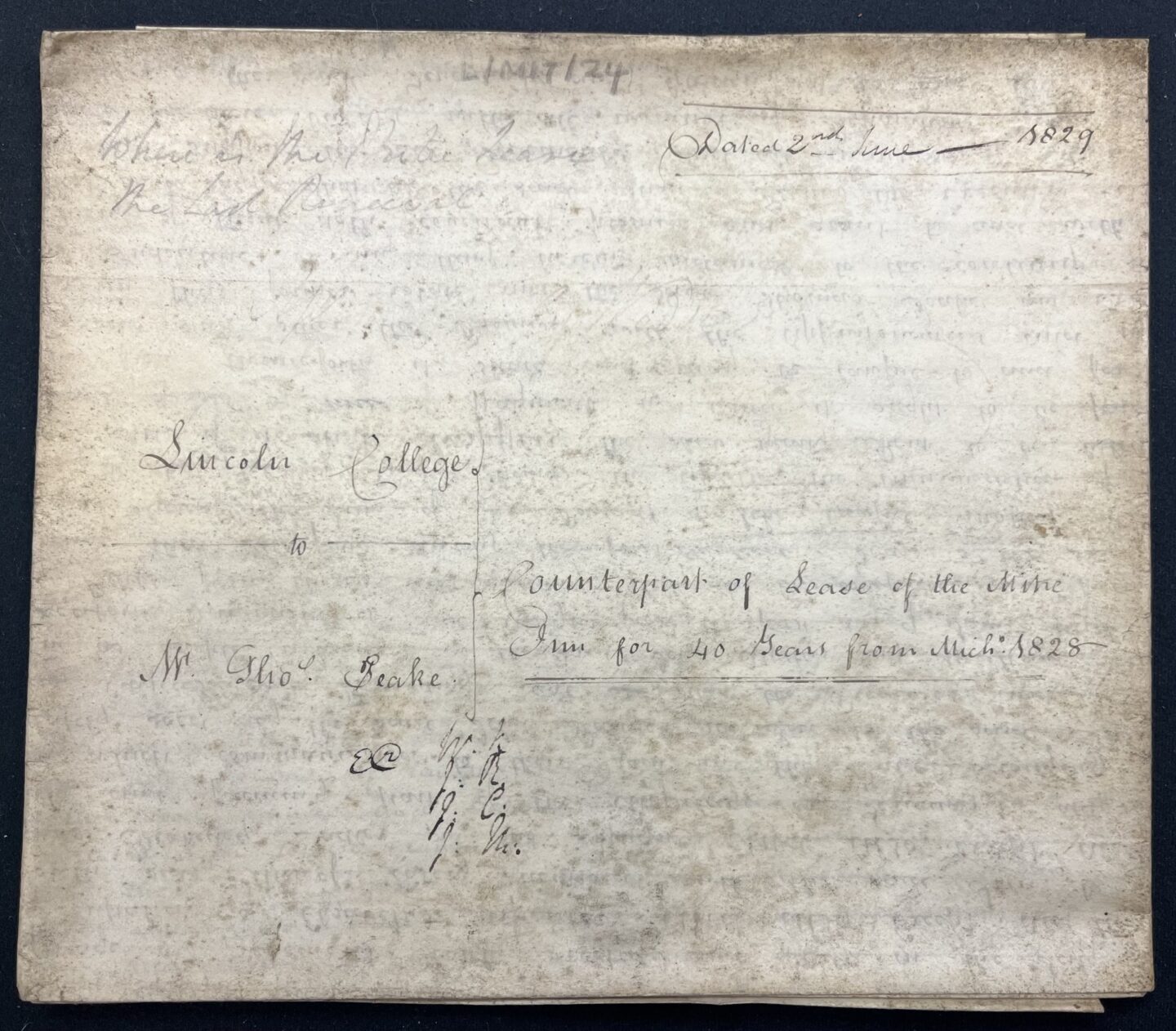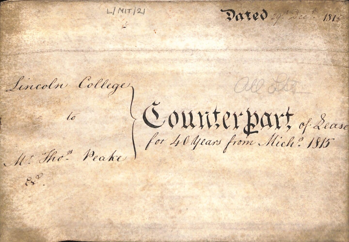 Counterpart Leases of the Mitre by Rector Edward Tatham for Lincoln College to Thomas Peake, innkeeper. The term of the lease is for 40 years from 1815, extended for another 40 years from 1828. Ref: LC/EL/MIT/L/21, 24