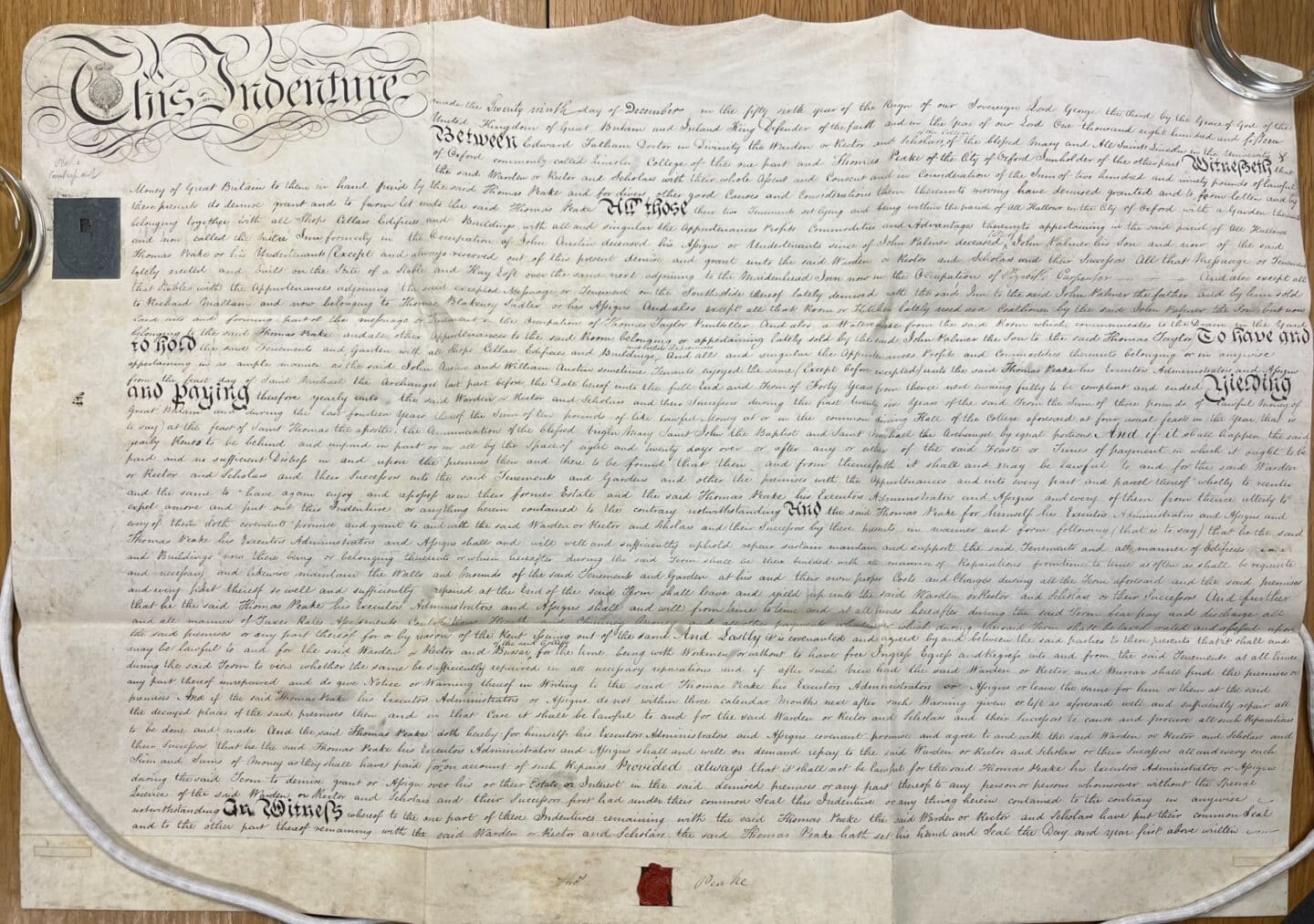 This indenture is the first extant lease of the Mitre in the College Archive. The agreement is between Richard Kilbye, Rector of Lincoln College, and Henry Wilkes, glover. The Mitre, recorded as "two tenements, & garden, w[i]th all shopps, cellars, edefices & buildings" was leased for 40 years. The annual rent was £3, paid quarterly in equal parts.