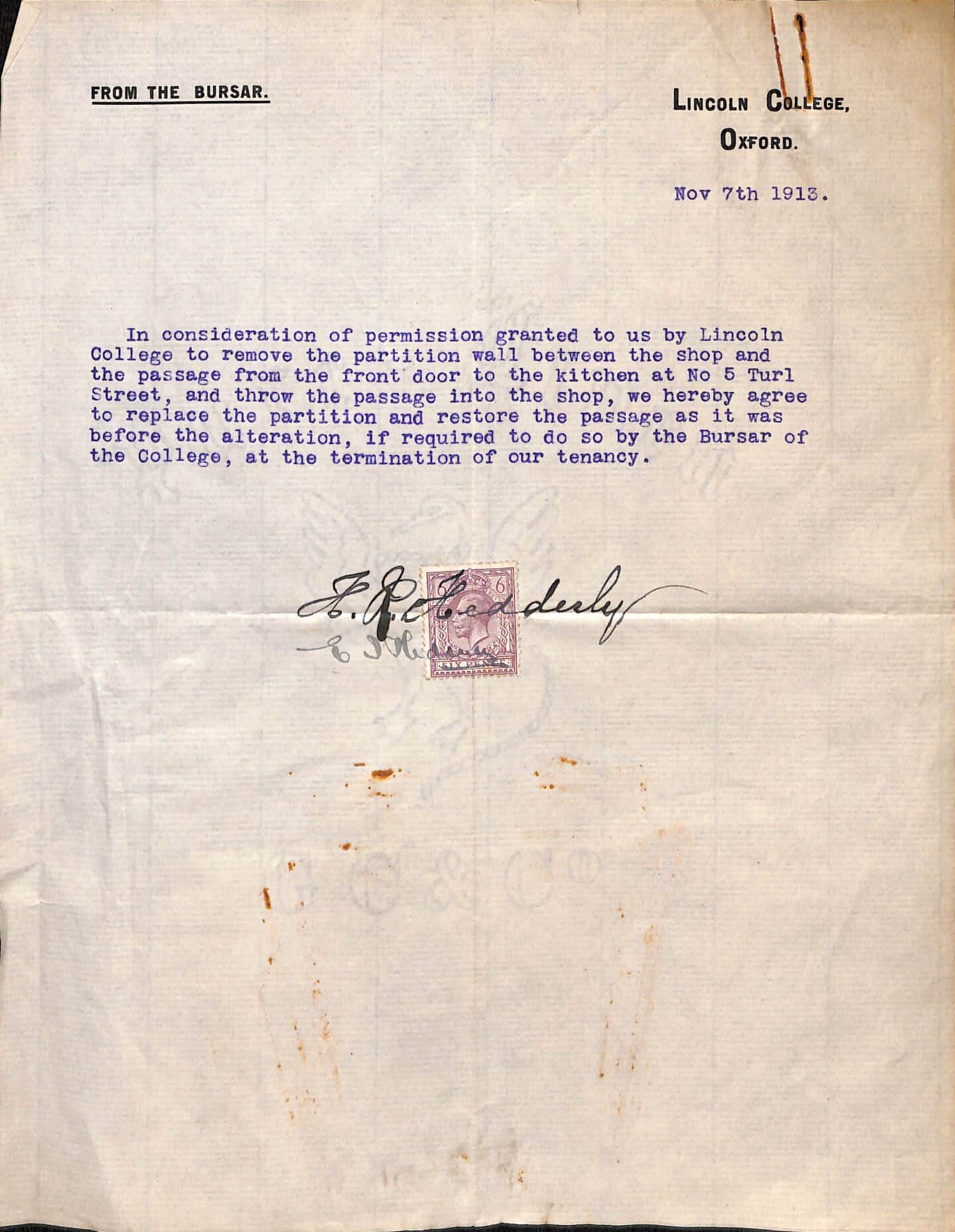 The `shopps' mentioned as part of the Mitre in the 15th and 16th century leases still provide space for trading. Here is a plan for the alteration to the shop layout by a tenant at 5 Turl Street. Ref: LC/EL/MOD/2/2 7 November 1912