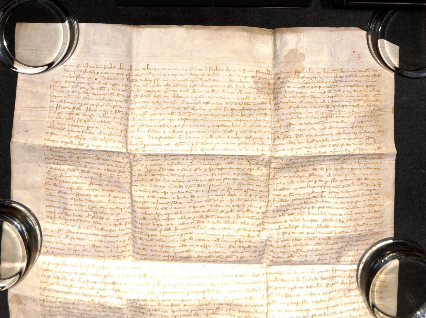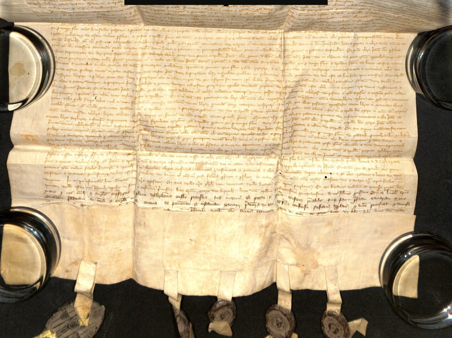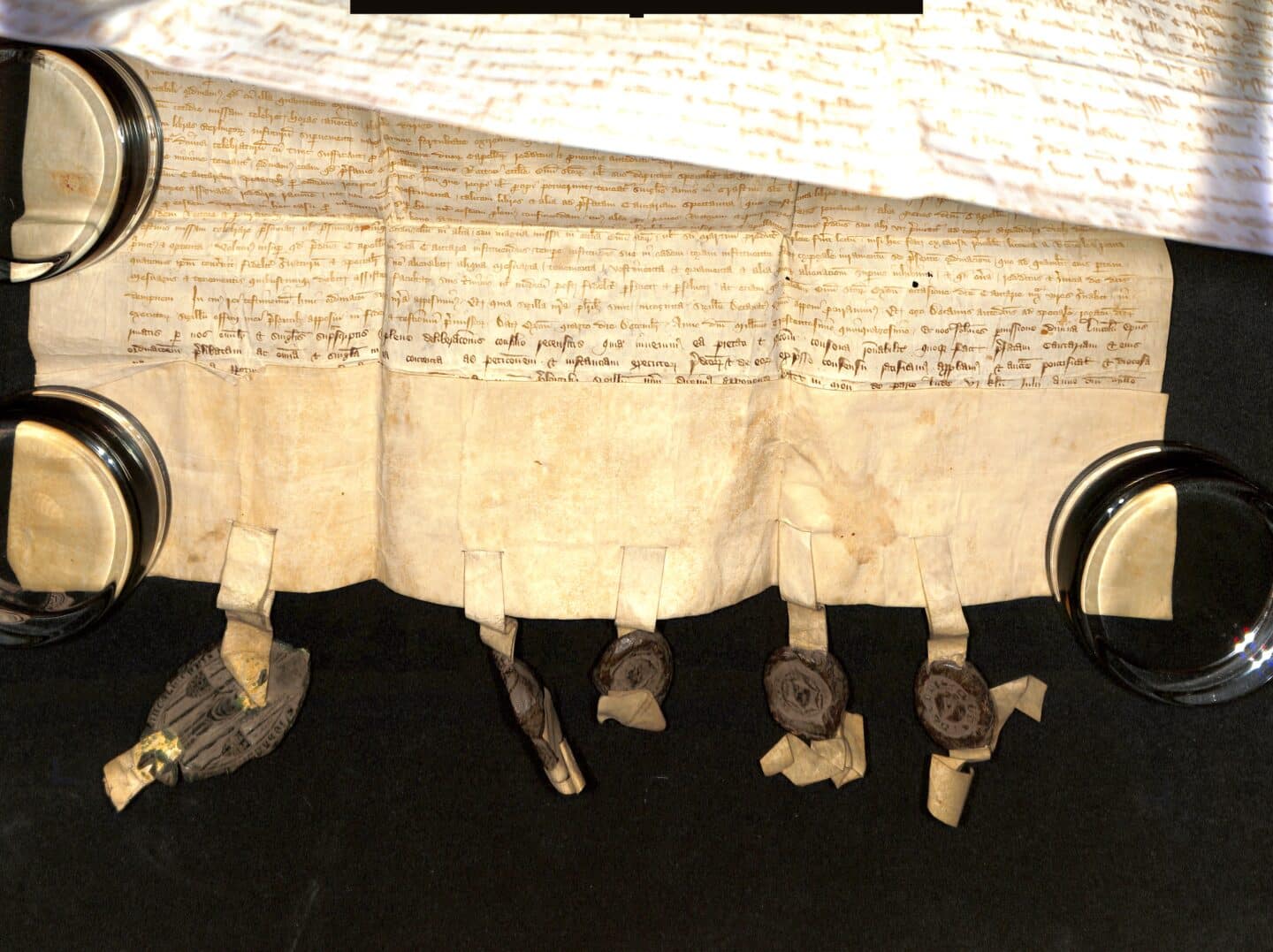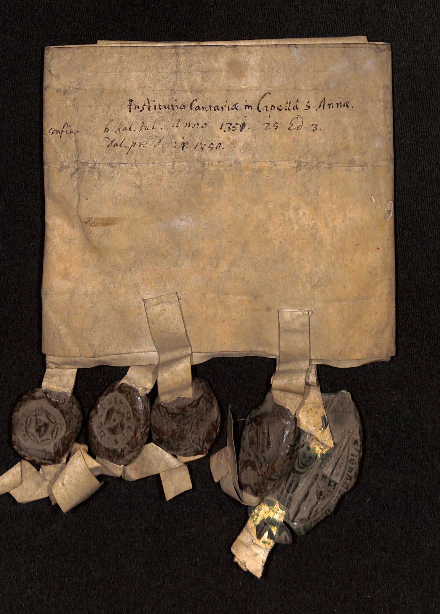 This deed of foundation of St. Anne's Chantry in All Saints' church records the bequest of Nicholas de Burcestre to maintain the chantry. Details of the services, plate, vestments, and other arrangements are listed and confirmed by the Bishop of Lincoln.