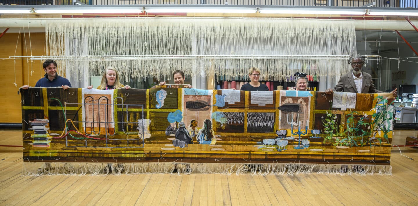 Earlier this week, the major tapestry commissioned by Lincoln College and designed by artist Hurvin Anderson to celebrate our 600th anniversary was cut off the loom at a special ceremony held at Dovecot Studios in Edinburgh.